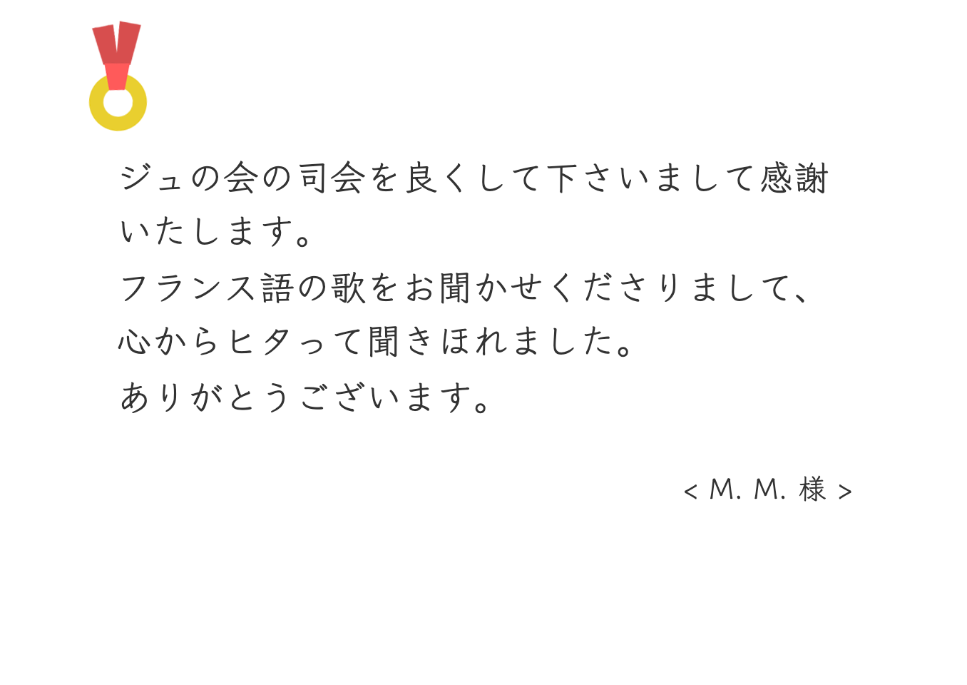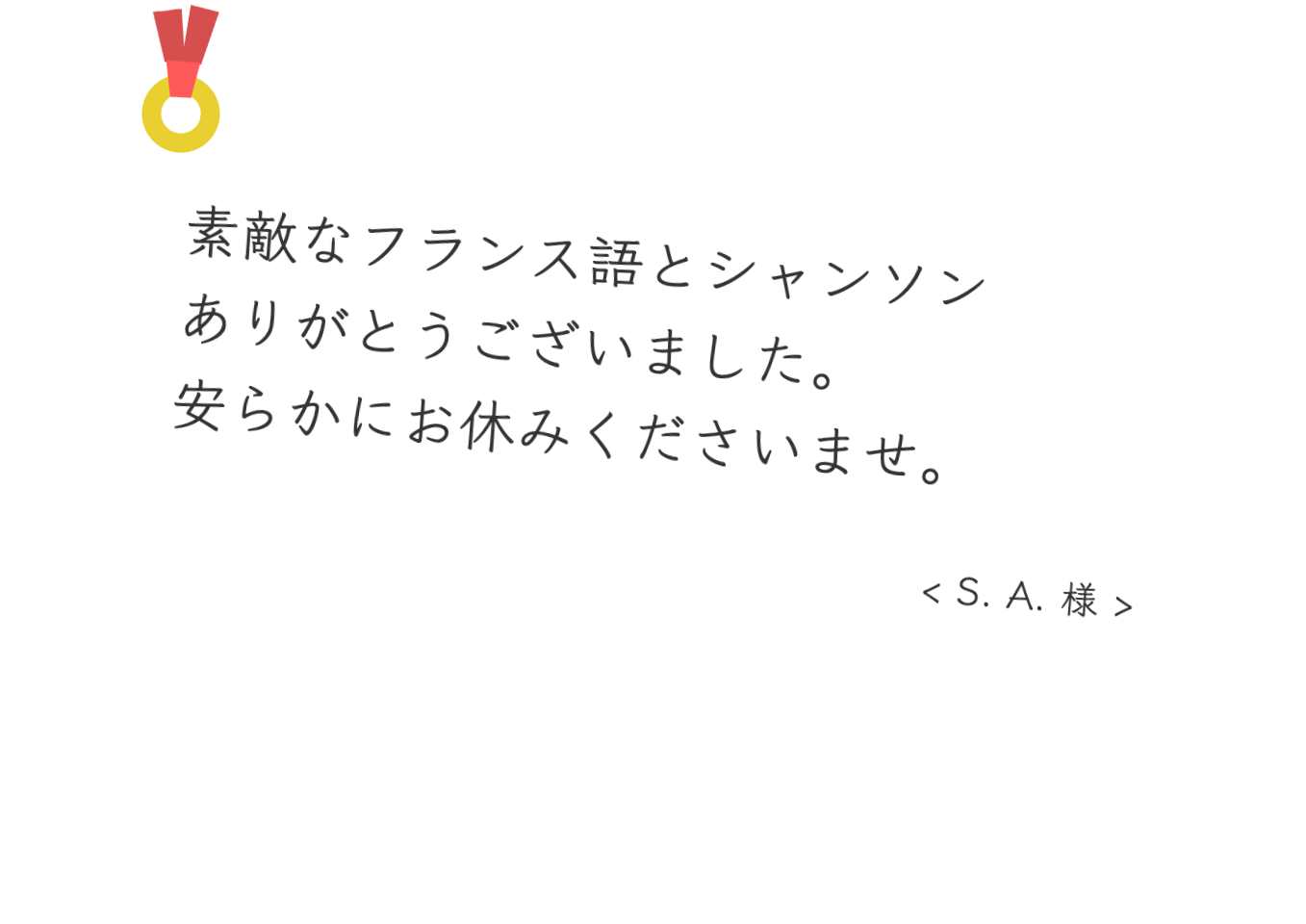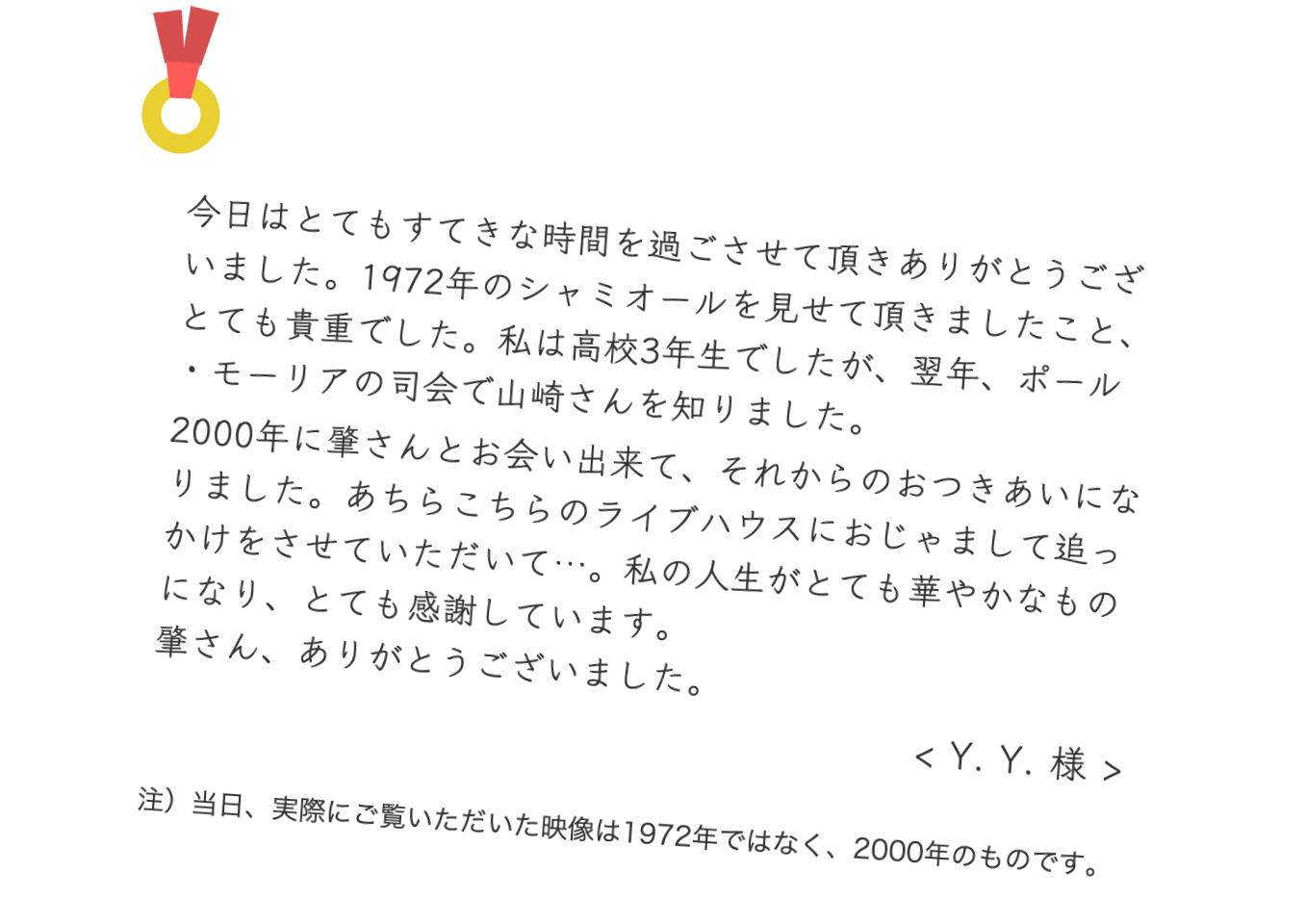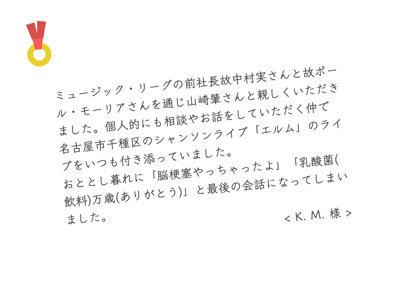 シャンソン歌手であり、コンサートの司会者であり、そしてシャンソン教室の先生であった山崎肇さんを、参加していただいたみなさんで振り返り、思い出を共有することができたのではないかと思います。