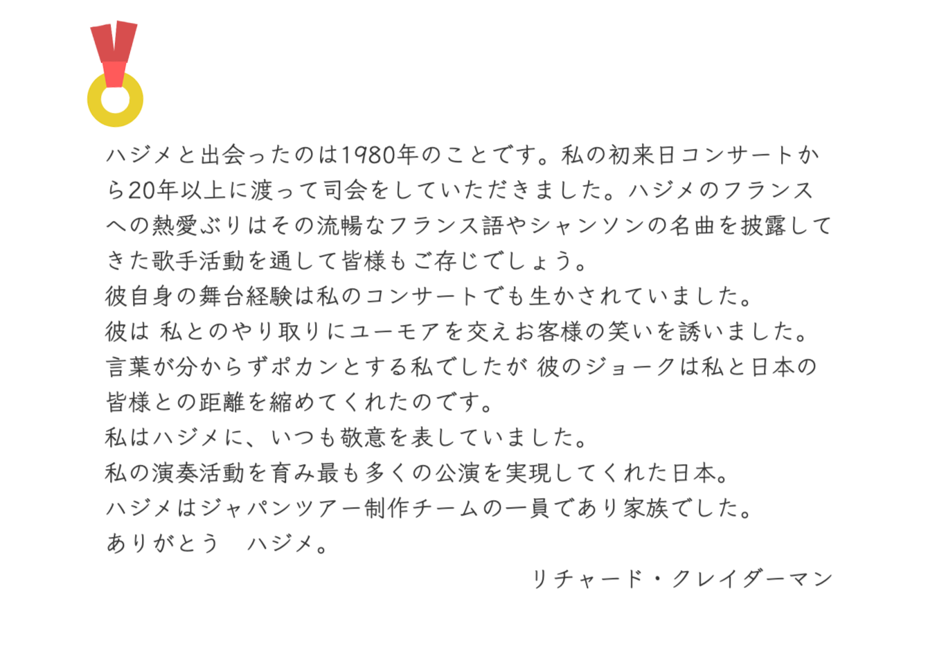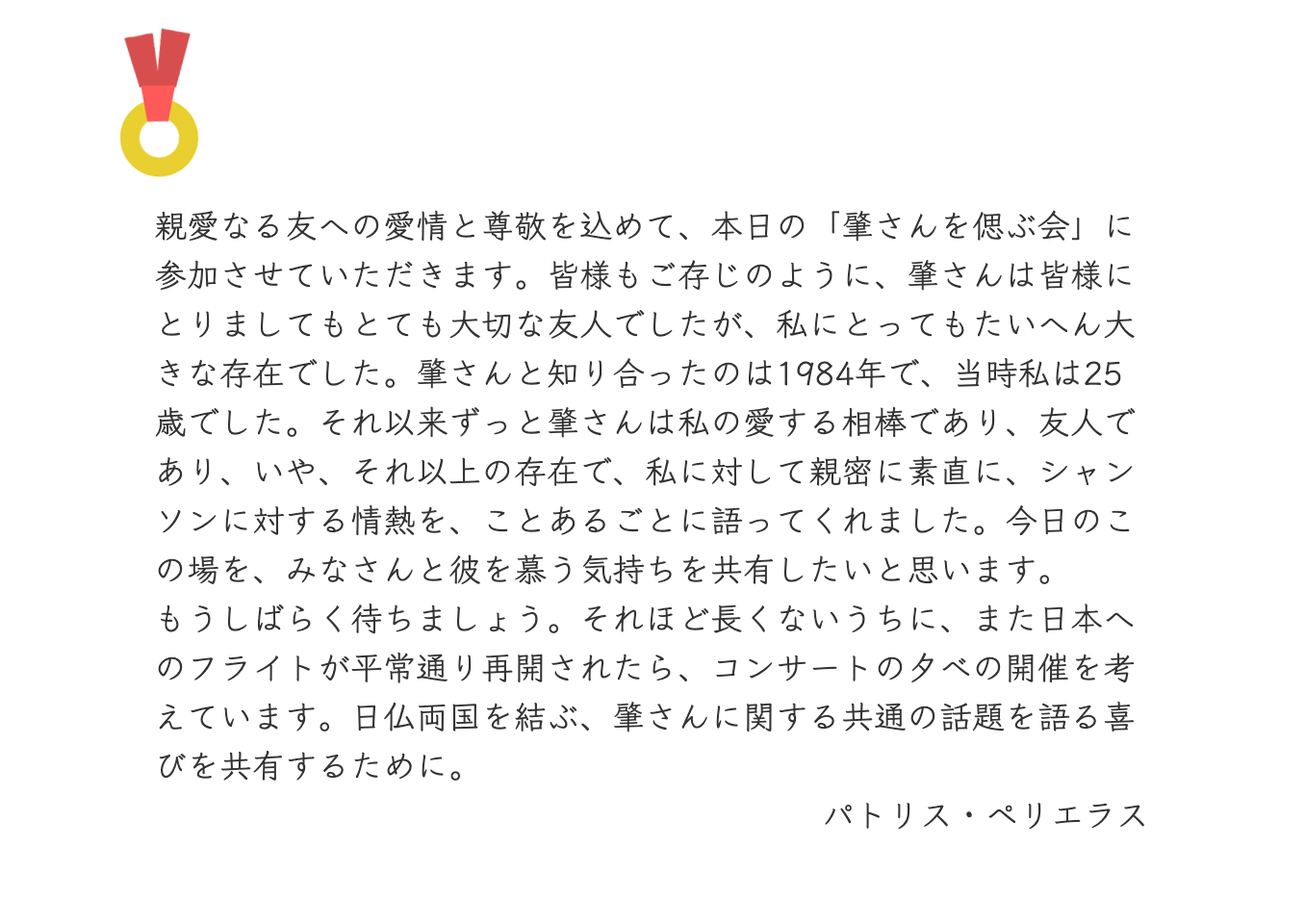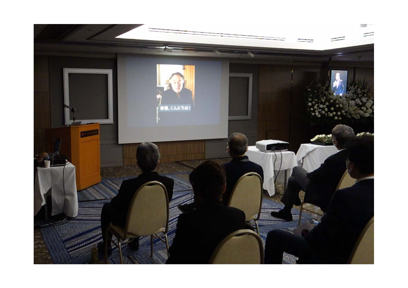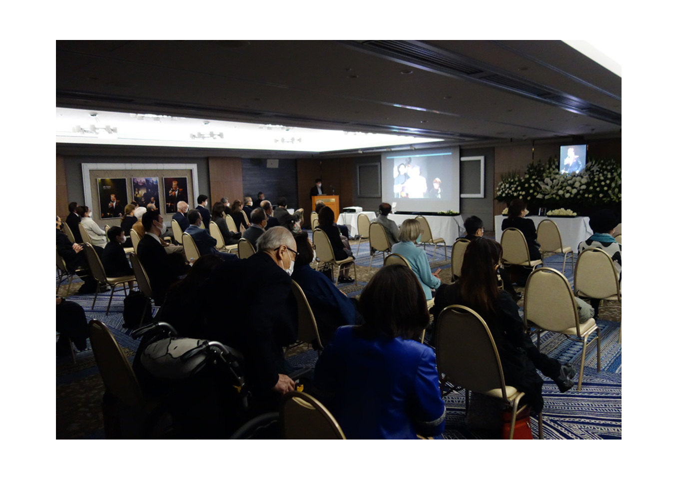 当日は、1972年に初めてフランスのオーケストラの司会を始められた時からいっしょに仕事をされていた、キョードー東京の山崎芳人様、80を間近にして母校に通いフランス語を基礎から学び直した際の先生でいらっしゃった、暁星学園フランス語教育特別顧問の橘木芳徳様のおふたりから山崎肇さんの思い出を語っていただき、さらに、パトリス・ペリエラス様、リチャード・クレイダーマン様からのビデオ・メッセージの投影、肇さんの妹様からのご挨拶と続き、肇さんの歌(CD)が流れる中で献花をおこなったあと、2000年4月に新橋シャミオールで開催されたコンサートの映像を楽しみました。