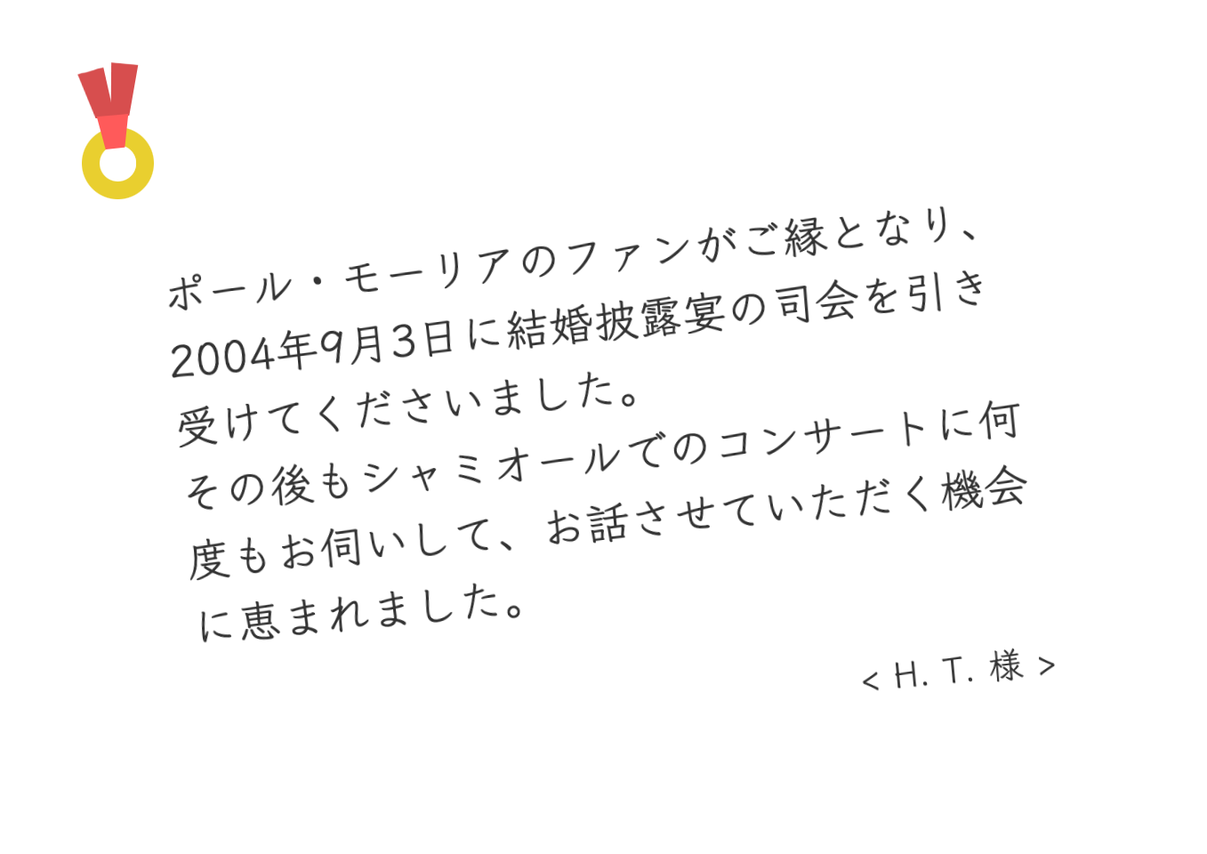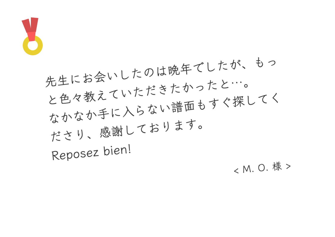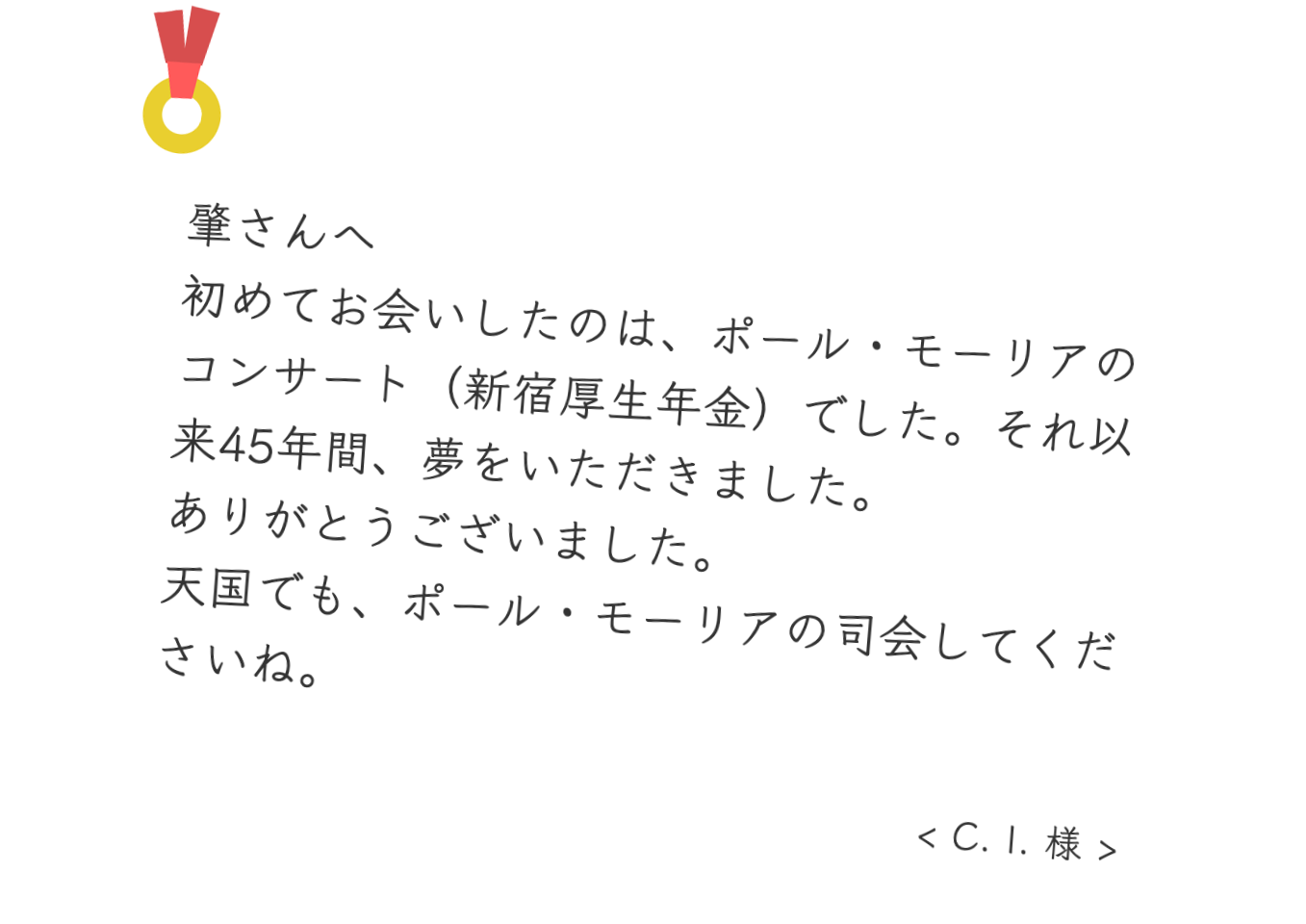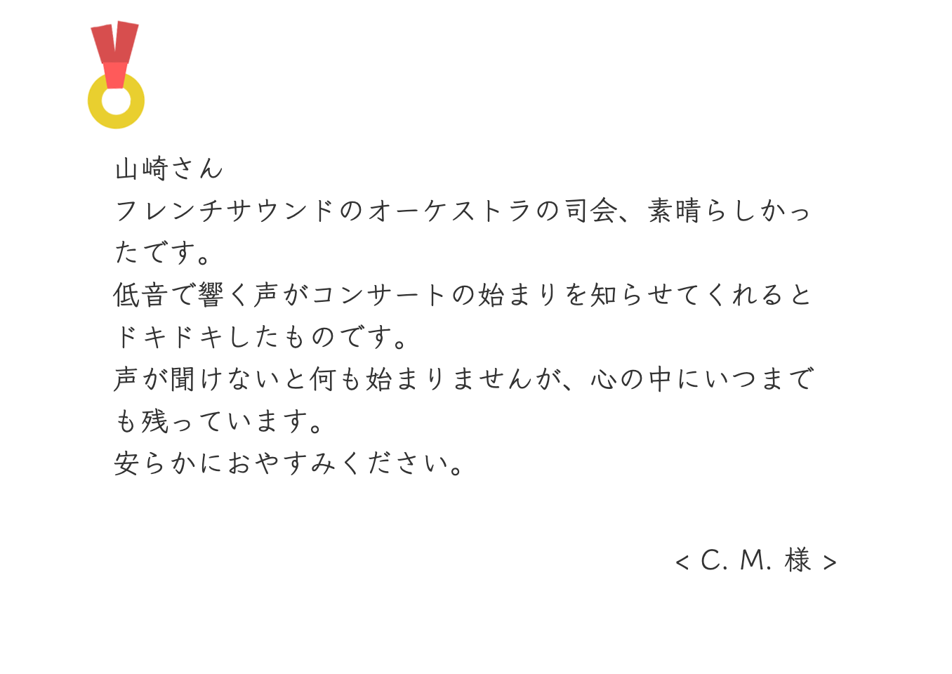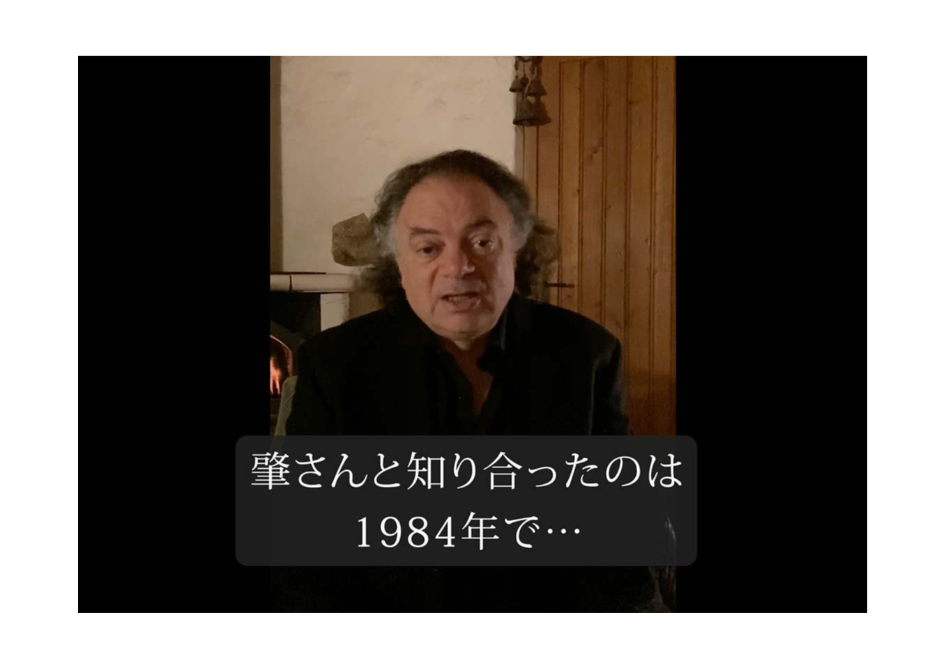 当日は、1972年に初めてフランスのオーケストラの司会を始められた時からいっしょに仕事をされていた、キョードー東京の山崎芳人様、80を間近にして母校に通いフランス語を基礎から学び直した際の先生でいらっしゃった、暁星学園フランス語教育特別顧問の橘木芳徳様のおふたりから山崎肇さんの思い出を語っていただき、さらに、パトリス・ペリエラス様、リチャード・クレイダーマン様からのビデオ・メッセージの投影、肇さんの妹様からのご挨拶と続き、肇さんの歌(CD)が流れる中で献花をおこなったあと、2000年4月に新橋シャミオールで開催されたコンサートの映像を楽しみました。